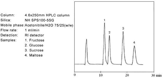 糖類的分離通常用到的是乙腈/水做流動(dòng)相。當(dāng)乙腈的含量增加,保留因子k’增加。但是乙腈的含量需要仔細(xì)的控制,因?yàn)殡S著乙腈含量的增加,樣品的溶解性會(huì)變差。