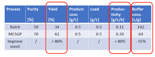 ??? 有案例證明,MCSGP可將產(chǎn)品純度從傳統(tǒng)工藝的59%提升至70%,將收率從傳統(tǒng)工藝的34%提升至61%,從而使產(chǎn)量(g /L /h)整體提升80%,并同時(shí)使Buffer的消耗量降低55%。MCSGP工藝,無疑可顯著地節(jié)約成本投入,并可產(chǎn)生更多的生產(chǎn)效益。
