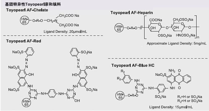 Toyopearl AF-Chelate-650M填料結(jié)合了亞氨基二乙酸(IDA),其濃度約20μmol/ml。通常與填料穩(wěn)定螯合的金屬離子有Cu2+,Ni2+,Zn2+和Co2+等。金屬螯合后的填料可結(jié)合氨基酸序列中含組氨酸和自由半胱氨酸的多肽或蛋白質(zhì)。IMAC親和層析可用于純化重組人生長(zhǎng)因子,組織型纖溶酶原激活劑,血型糖蛋白以及整個(gè)細(xì)胞。