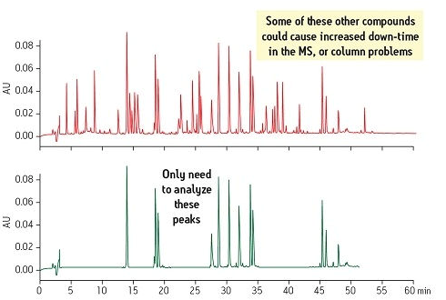 另一種考慮是存在于樣品基質(zhì)中的各種干擾物在每次進(jìn)樣時(shí)可能會蓄積導(dǎo)致儀器停機(jī)。如果這些干擾物能在樣品制備期間被除去,那么目標(biāo)化合物就能使用一種更簡單、更穩(wěn)定的方法進(jìn)行分析(圖3)。此圖將位于靠上位置的原始樣品與位于靠下位置的經(jīng)SPE制備后的新樣品進(jìn)行了比較。