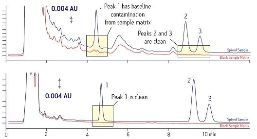 凈化樣品基質(zhì)所帶來的一個(gè)額外的優(yōu)勢是定量準(zhǔn)確度得以提高。圖4頂部所示的化合物1的藍(lán)色譜圖最初看起來似乎是可以接受的。然而,當(dāng)與其正下方用紅色顯示出的空白樣品基質(zhì)譜圖對比時(shí)可以發(fā)現(xiàn),其中的確存在源自樣品基質(zhì)中的某些污染物??肯碌淖V圖通過采用一種適當(dāng)?shù)腟PE試驗(yàn)方案而得出,表明同樣的化合物不存在干擾問題,從而使得定量準(zhǔn)確度顯著提高。