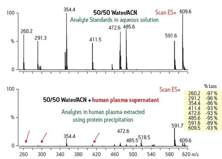 復(fù)雜樣品基質(zhì)帶來的第二種問題在我們觀察質(zhì)譜輸出圖譜(LC/MS或LC/MS/MS)時(shí)可以看到。為了獲得適當(dāng)?shù)馁|(zhì)譜響應(yīng)信號(靈敏度),必須使該化合物離子化。如果該化合物離子的形成因樣品基質(zhì)干擾物而受阻,那么相應(yīng)的信號強(qiáng)度也會大大減弱。