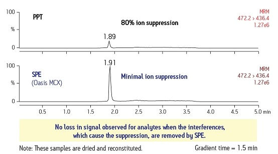 在有些情況下,源自樣品基質(zhì)的干擾物可能會增加某種化合物的信號,這叫做離子增強(qiáng),可導(dǎo)致響應(yīng)值偏高。適當(dāng)?shù)腟PE方法可通過將干擾物與該化合物分離開來而最大限度減弱這種效應(yīng),從而使響應(yīng)值更準(zhǔn)確。