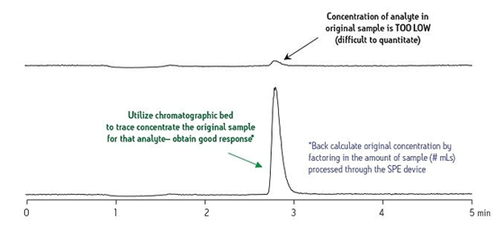 分析環(huán)境樣品中的痕量污染物或者代謝物在生物液體內(nèi)隨時(shí)間的變化情況就是一個(gè)可以說明這一點(diǎn)的較好例子。圖9中靠上的圖譜表明使用原始純樣品進(jìn)行分析時(shí),目標(biāo)化合物的信號響應(yīng)差。通過以SPE作為痕量濃縮策略制備樣品后再使用相同的分析條件進(jìn)行分析后所獲得的靠下的圖譜表明這種化合物的信號強(qiáng)度顯著提高。根據(jù)這一結(jié)果,我們可以準(zhǔn)確計(jì)算出純樣品中的原始化合物濃度。