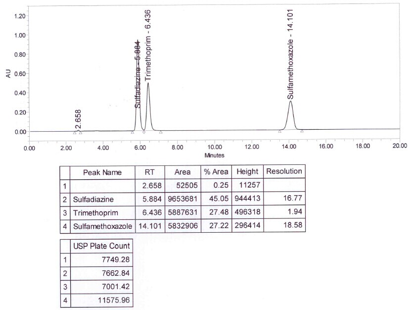 ??? 下圖是用Merck Hibar Purospher STAR LP 柱,使用藥典的方法,對聯(lián)磺甲氧芐啶片中磺胺甲噁唑、磺胺嘧啶和甲氧芐啶含量進行測試的譜圖,請參考。