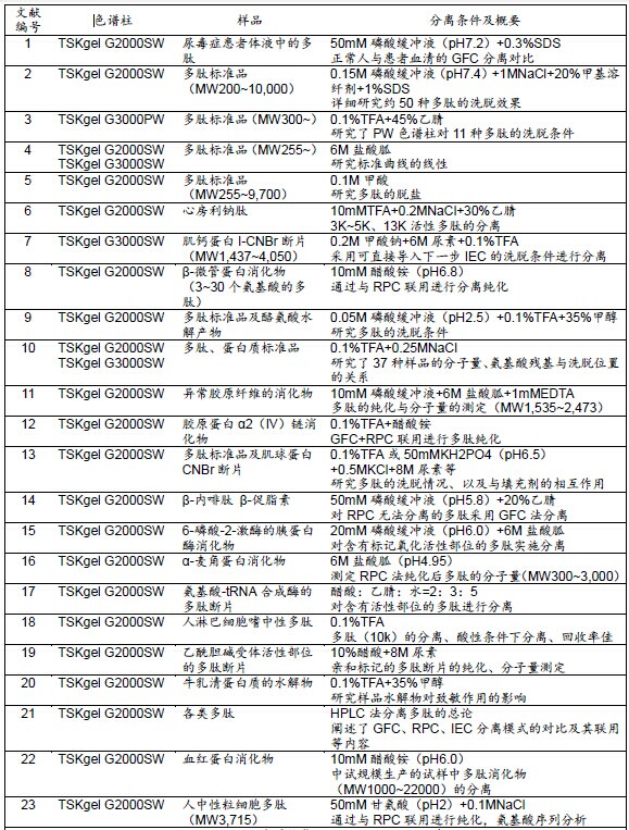 ??? 表1所示為TSKgel色譜柱在采用GFC法進(jìn)行多肽分離的相關(guān)文獻(xiàn)及其概要。