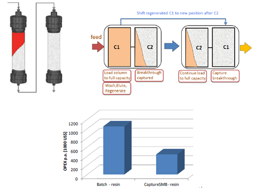 傳統(tǒng)層析工藝,由于流穿效應(yīng),有30-50%的填料是無法被完全利用的,從而使得載量和處理量大為受限。Capture SMB用于優(yōu)化捕獲環(huán)節(jié),作為最簡單和最強(qiáng)大的2柱位設(shè)計,可使純化效率顯著提高,并且使填料用量大為縮減。