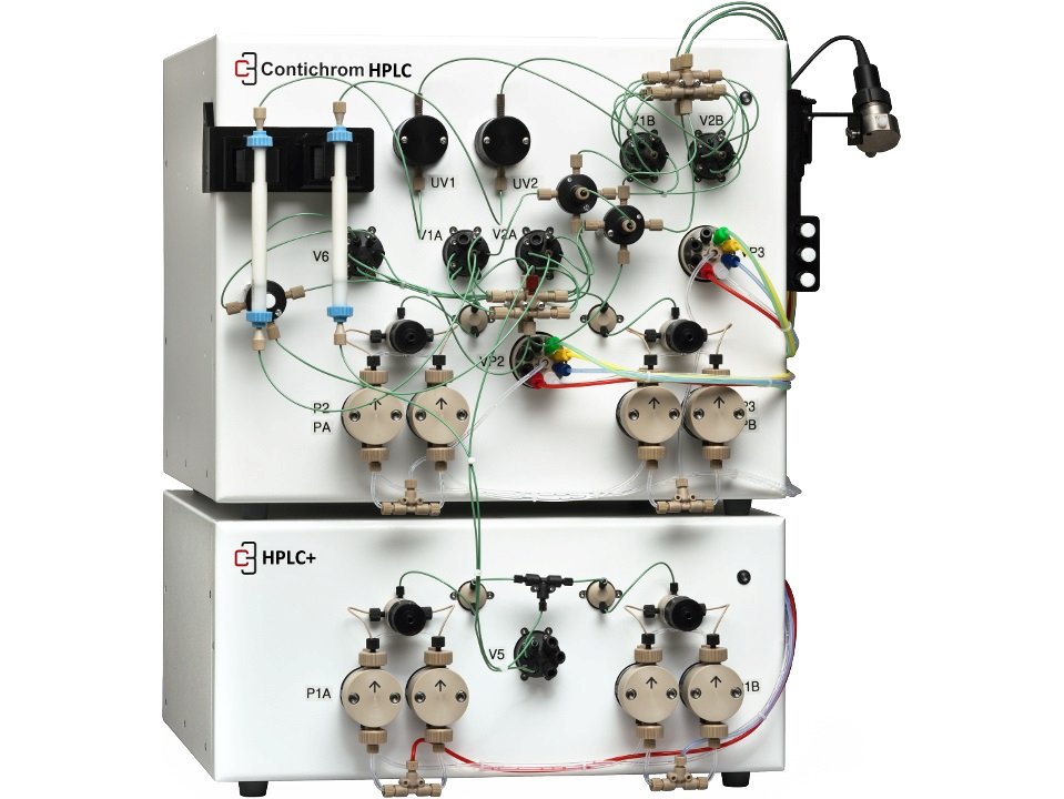 所有的Contichrom系統(tǒng)可以將兩個層析步驟(例如捕獲和精純)整合為一個單一的過程,第一步層析洗脫的產(chǎn)物可以直接被稀釋,從而直接進(jìn)行第二步層析,因此省略了中間的間歇過程,這是非常適用于高生產(chǎn)量純化的。