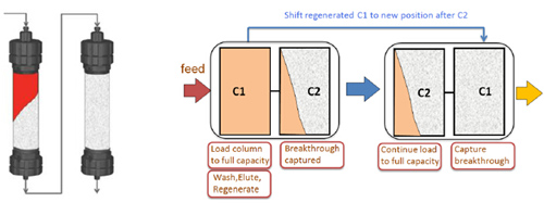 傳統(tǒng)親和層析工藝,由于流穿效應(yīng),有40-60%的填料是無法被利用的,從而使得載量和處理量大為受限。Capture SMB用于優(yōu)化捕獲環(huán)節(jié),作為最簡單和最強(qiáng)大的2柱位設(shè)計,可使純化效率顯著提高,并且使填料用量大為縮減。