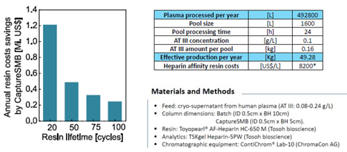 從預(yù)處理血漿中捕獲AT-III通常采用肝素親和層析法。將單柱Batch工藝與Capture SMB進(jìn)行對比實(shí)驗,使用親和填料TOYOPEARL? AF-Heparin?HC-650M,用血漿上清液(AT-III:0.08-0.24 g/L)進(jìn)行上樣,采用TSKgel Heparin-5PW分析柱進(jìn)行濃度測定,最終研究表明,采用Capture SMB,可使填料載量提高45%,產(chǎn)率提高38%,同時使緩沖液消耗量降低29%。