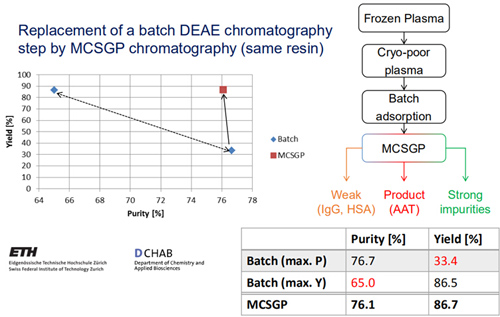 從血漿中純化AAT需采用DEAE離子交換層析,有研究表明,采用單柱Batch工藝純化AAT,產(chǎn)品純度76.7%時,收率為33.4%;產(chǎn)品純度65.0%時,收率為86.5%,純度和收率此消彼長。采用MCSGP工藝后,可在產(chǎn)品純度76.1%時,仍保證收率為86.7%。
