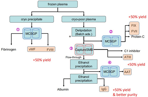 連續(xù)流層析可應(yīng)用于血液制品純化的多個階段,有效提高純化效率,改善收率和純度,詳見下圖:
