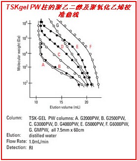 TSKgel PW柱由親水性球形聚甲基丙烯酸酯顆粒填充,粒度從12um(小孔徑柱)到17um(大孔徑柱)不等。PW柱的主要應(yīng)用范圍在于分析水溶性聚合物,如纖維素、丙烯酰胺、二醇、葡聚糖、聚乙烯醇和低聚糖等。